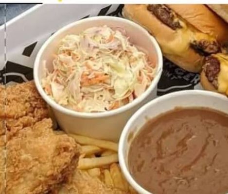 4 Cheeseburgers, 6 Chicken Fingers, large Fries, Large Coleslaw, Large Gravy