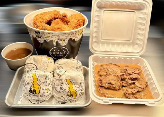 6pc Fried Chicken Bucket, 6 Piece Burger Steak, 4 Rice, Large Gravy