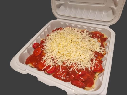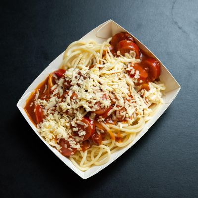 Our House made Filo-Style Spaghetti with Grated Cheddar Cheese, minced beef and chicken hotdog