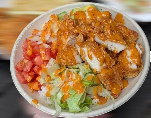Southern Fried Chicken Bites, White Rice, Shredded Iceberg Lettuce, Tomato, Diced Onion, Smashed Avo (Choice of Sauce)