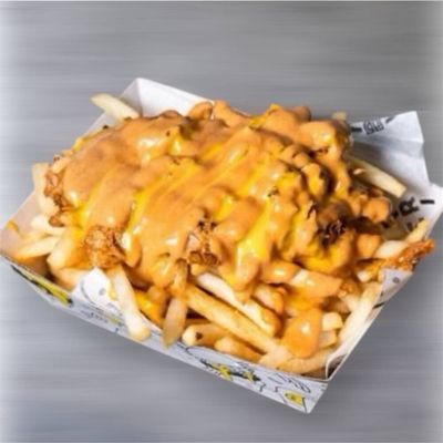 Shoestring Fries Loaded With Bbq Glazed Pulled Pork, House Signature Cheese Sauce and BP Sauce