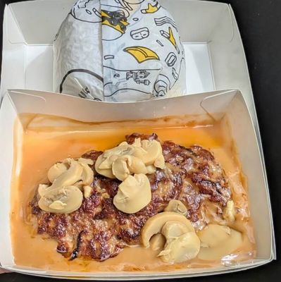 Our signature Angus Burger steak Patty over mushroom gravy, rice