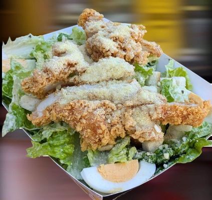 Southern Fried Chicken Strips, Crisp Cos Lettuce, Parmesan, Baconaise (contains pork), Croutons, Free Range Boiled Egg