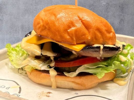 Grilled Filled Mushroom, American Cheese, Grean Oak Lettuce , Tomato, Pickles, Signature Burger Sauce